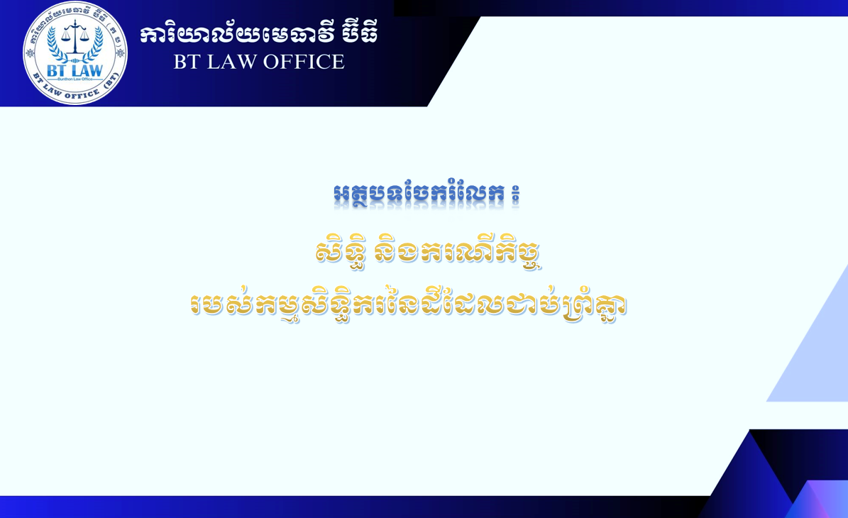 យោងតាមក្រមរដ្ឋប្បវេណី នៃព្រះរាជាណាចក្រកម្ពុជា បានកំណត់អំពីសិទ្ធិ និងករណីកិច្ចរបស់កម្មសិទ្ធិករនៃដីដែលជាប់ព្រំគ្នា ដូចខាងក្រោម ៖